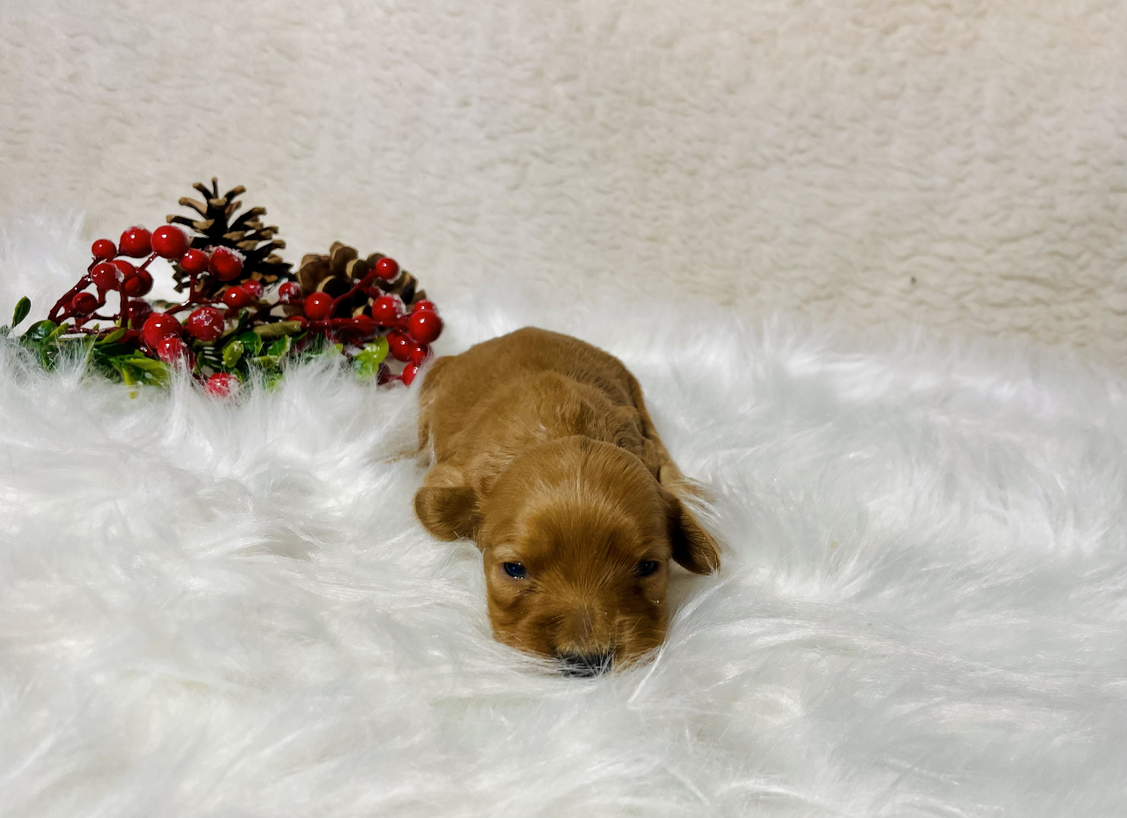 # 10 Bella/Archie - Beautiful deep red cockapoo female, she has a cute white marking! $2000